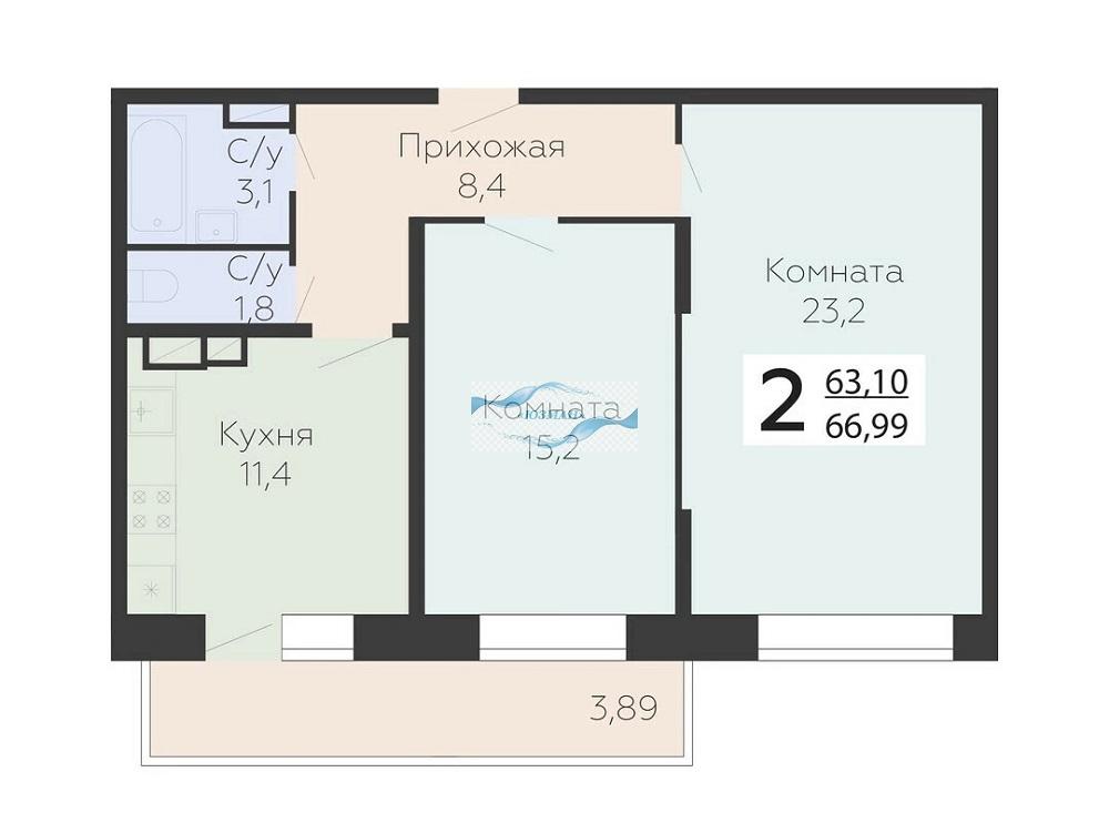Двухкомнатная квартира в ЖК "Онегин", общей площадью 66,99 кв.м.